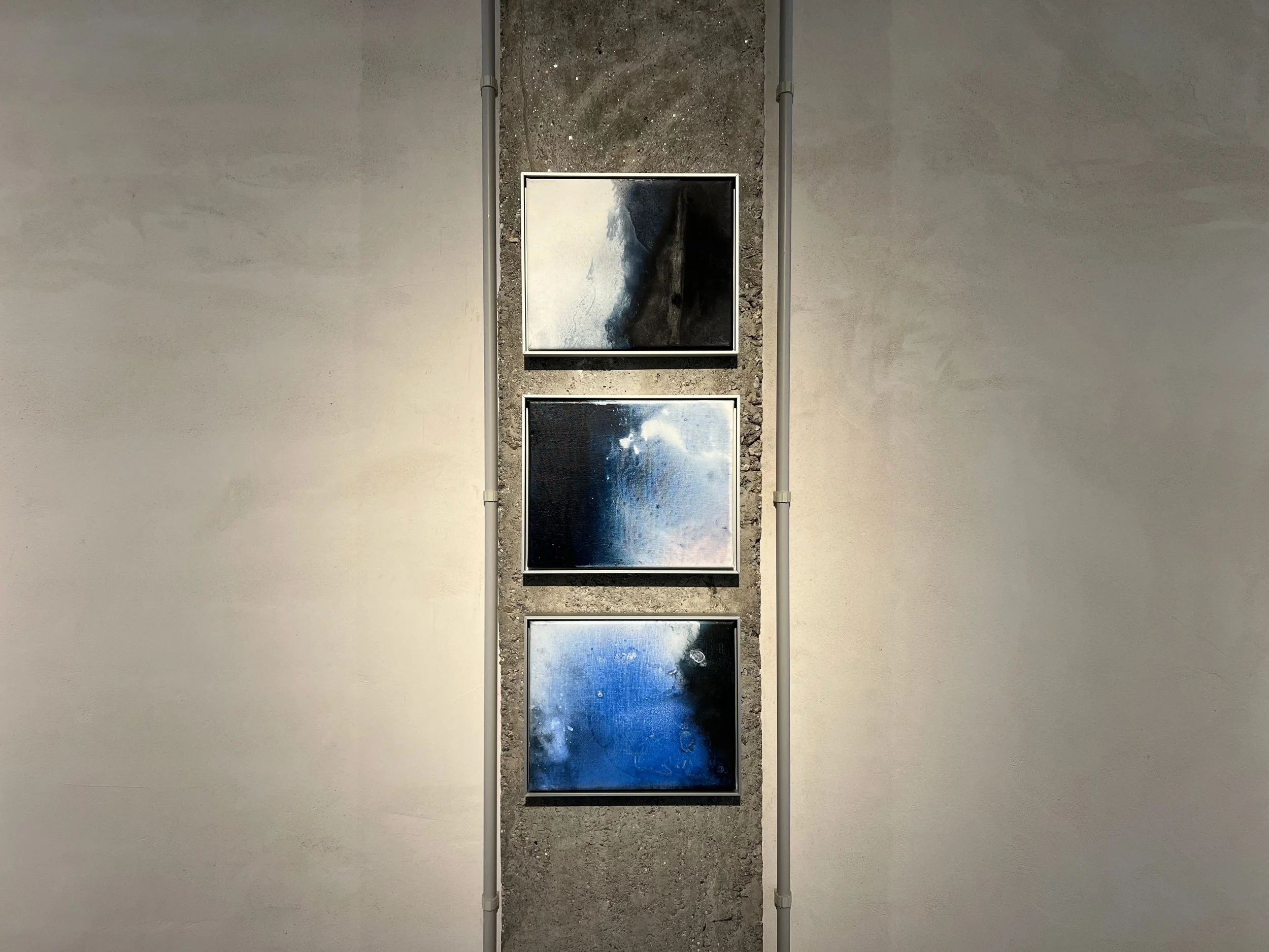 Para empezar, Luis Moscardó muestra una serie realizada el año pasado, que anteriormente se ha expuesto en el Faro de Vilaño de Camariñas y que funciona como un hilo de unión entre el paisaje marítimo y la pintura informalista. En total son 24 pinturas realizadas al óleo sobre lienzo, de formato cómodo (pequeño tamaño) que representan de manera obsesiva y pasional las vistas que el artista tiene desde la ventana de su casa, con vistas al mar. En las obras observamos la bravura del mar, de las olas y la espuma que deja a su paso en la orilla, el volumen del agua en el mar, su profundidad y su textura, varios tonos de azul que se mezclan con el blanco del lienzo para situarnos en un lugar y una franja horaria del día determinada. Es decir, podemos ver como se ve el mar en el amanecer, a plena luz del día, al atardecer o incluso en la oscuridad de la noche, representada por sutiles pinceladas de negro sobre la superficie del cuadro. La forma de instalación de estas obras de Moscardó es cambiante, como lo son las mareas, que suben y bajan y por eso los cuadros se apoderan de las paredes de la galería formando composiciones horizontales y verticales muy medidas y con gran carga simbólica.